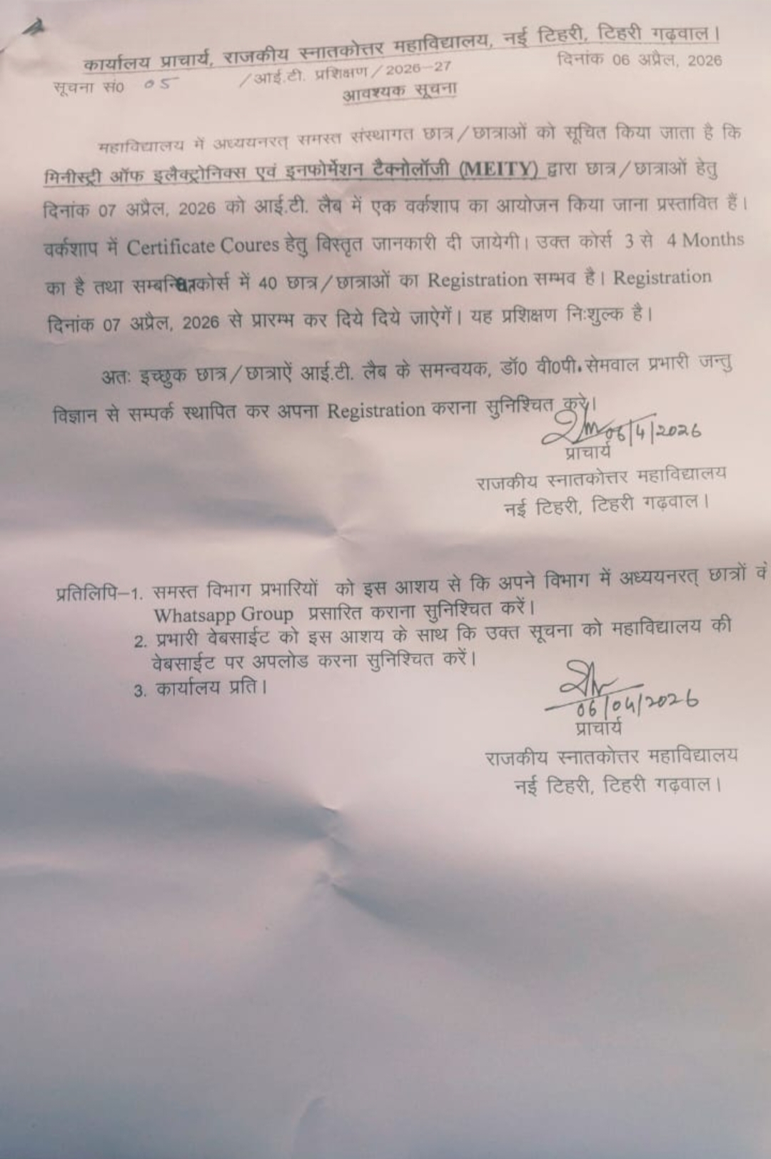 6 APR | Notice for students to enroll for Workshop by MEITY held on 7th April 2026 |
